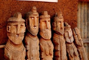 ويتم نحت الأشكال على أعمدة من الخشب أو الحجارة التي يتم نصبها في المناطق العامة. وأحيانا حول المنزل؛ فتجد حول بعض المنازل عددًا من الأعمدة أو النصب. منها ما يسمي “واكا”، وتعني الأب الكبير، وهو منحوت خشبي أو حجري تخليدًا للميت.