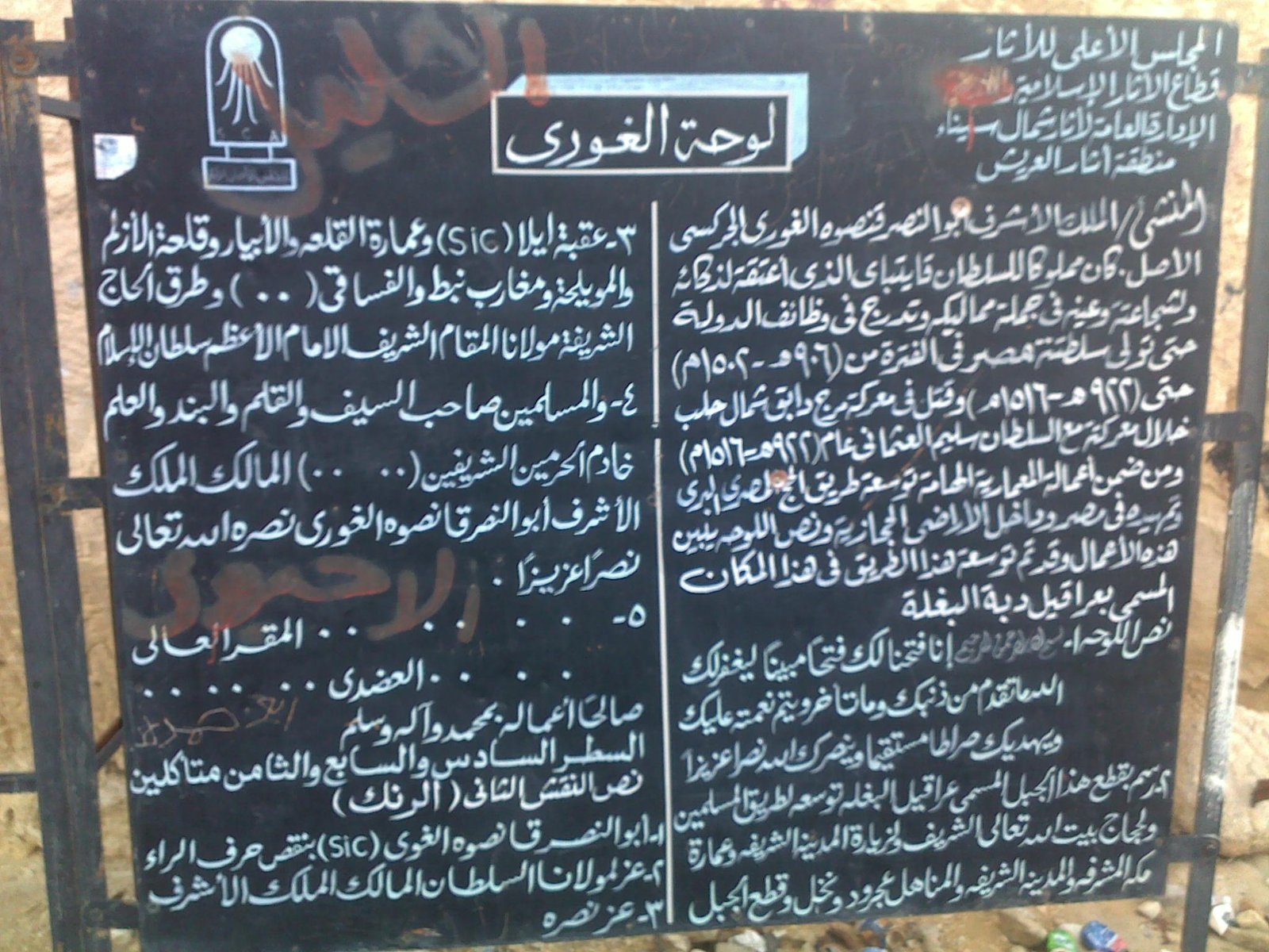 رسم بقطع هذا الجبل المسمى “عراقيب البغلة” ومهّد طرق المسلمين الحجاج لبيت الله تعالى .. وعمار مكة المكرمة والمدينة الشريفة والمناهل عجرود ونخل وقطع الجبل عقبة ايلا وعمار القلعة والآبار وقلعة الأزلم والموشحة ومغارب ونبط الفساقي.. وطرق الحاج الشريفة مولانا المقام الشريف والإمام الأعظم سلطان الإسلام والمسلمين .. الملك الأشرف أبو النصر “قنصوه الغوري” نصرهُ الله نصراً عزيزاً ..