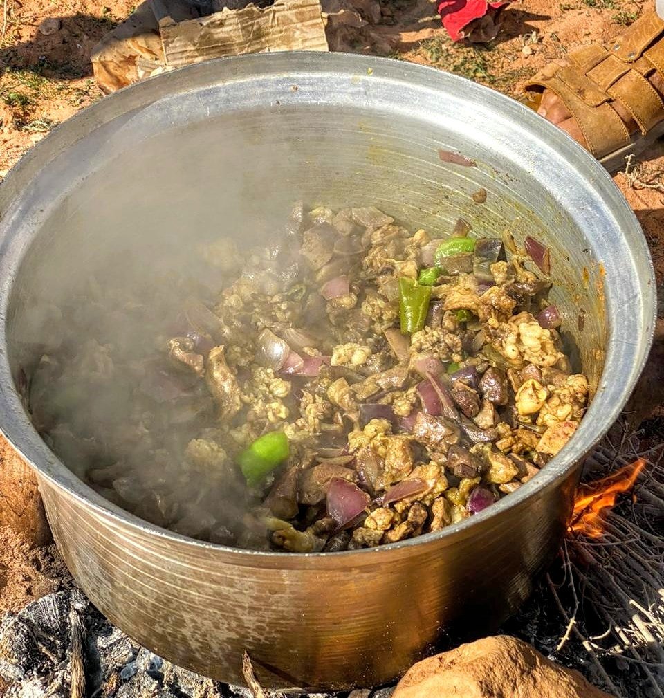 ويبدأ الشباب فى طهى الأكلات البدوية الشهيرة وهى اللحمة الضأن والمكرونة المبكبكة، وتسوية اللحمة مع المكرونة ويطلق عليها البعض «مكرونة جارية» وتعنى مكرونة مملوءة بالصلصة والطماطم ويجرى تسويتها مع اللحمة فى حلة واحدة.