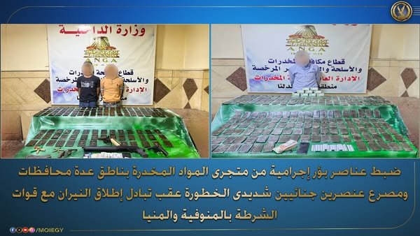 عقب تقنين الإجراءات تم إستهدافهم بالتنسيق مع قطاع الأمن المركزى ، وقد أسفر التعامل عن مصرع (عنصرين جنائيين شديدى الخطورة بالمنوفية و المنيا – محكوم عليهما بالسجن فى جنايات ” سلاح نارى – مخدرات – سرقة بالإكراه”) وضبط باقى عناصر تلك البؤر.. وبحوزتهم (أكثر من 169 كيلو جرام من المواد المخدرة المتنوعة “حشيش ، أيس” – 9 قطع سلاح نارى “2 بندقية آلية ، بندقية خرطوش ، 6 فرد خرطوش – سيارة).. هذا وتقدر القيمة المالية للمواد المخدرة المضبوطة بأكثر من (28) مليون جنيه.