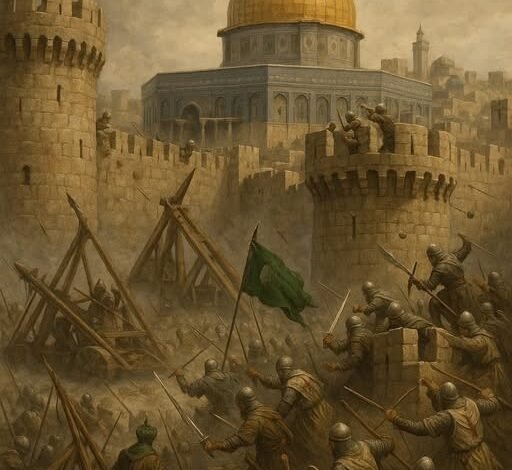 اقتربت اللحظة المصيرية، فوجه صلاح الدين أنظاره نحو القدس، تلك المدينة التي تسكن وجدان كل مسلم، حيث أمر جيشه بقصف الأسوار بالمجانيق، فانطلقت الحجارة تتطاير في السماء، بينما انهمرت السهام على المدافعين كسيل لا يتوقف، مع هذا الهجوم الشرس، تقدم المقاتلون وفتحوا ثغرة في الأسوار، وارتفعت رايات الإسلام فوقها تنذر بقرب الفتح، ورغم شجاعة المدافعين ومحاولاتهم المستميتة، إلا أنهم لم يستطيعوا تغيير مجرى المعركة، فاندفع المسلمون مرة أخرى في قتال مرير وحازم.
