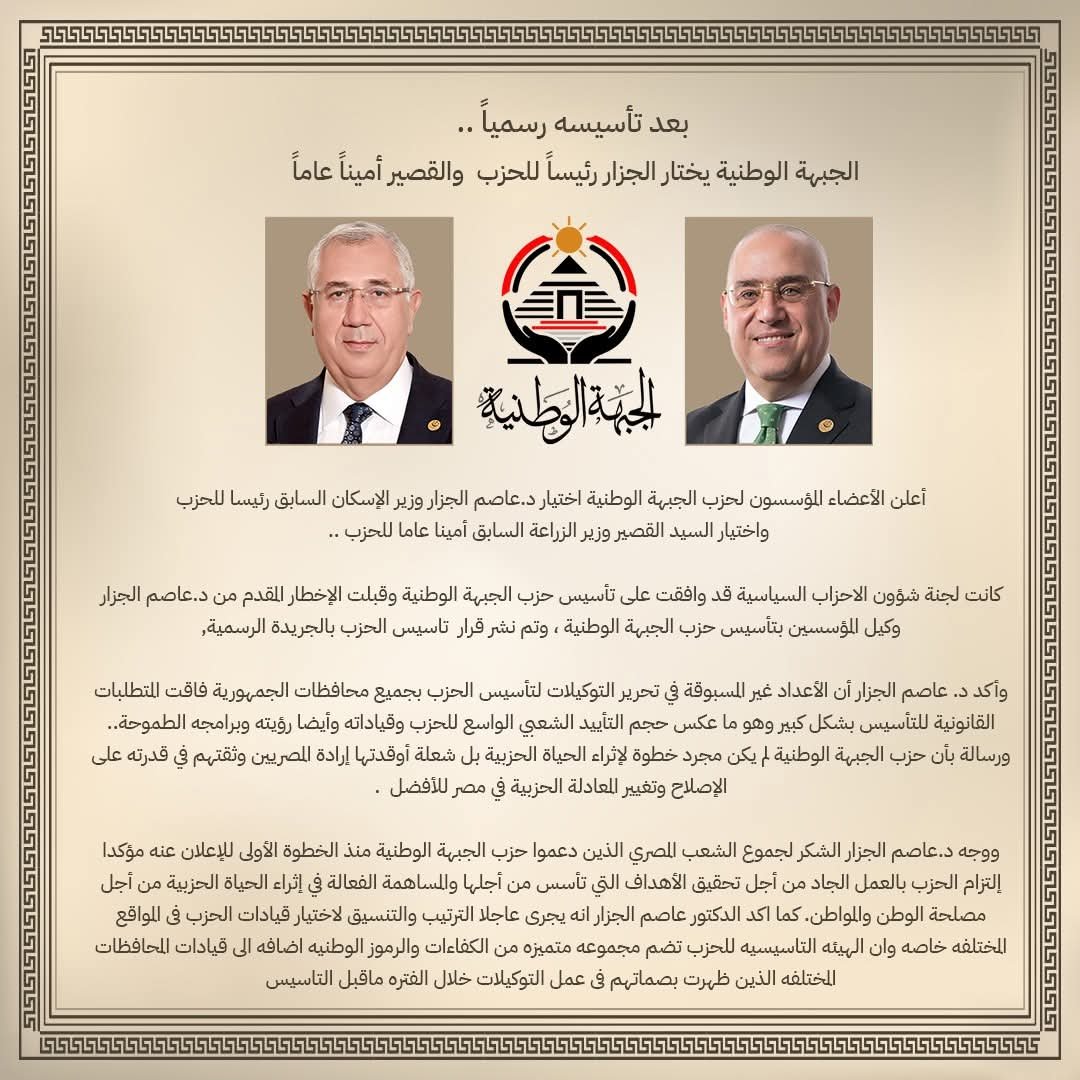 الجبهة الوطنية.. الجزار رئيسًا للحزب والقصير أمينًا عامًا