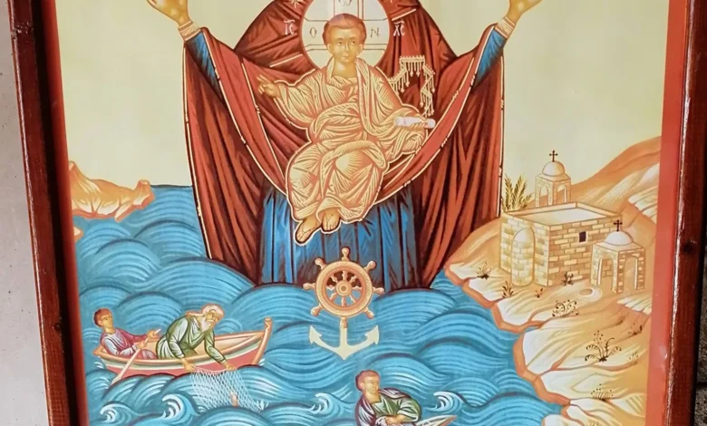 تحمل الأيقونة المكرسة للعذراء رمزية عميقة، إذ يظهر المسيح وهو يبارك البحارة الذين يجاهدون وسط الأمواج، فيما تقف مريم إلى جانب الكنيسة رافعة يدها اليسرى متضرعة إلى ابنها، وبيدها اليمنى تصد العاصفة لتحمي البشر، وتبدو الأمواج في الأيقونة بألوان سماوية وبحرية غنية، يزينها حضور الأسماك التي تحمل دلالات روحية في التراث الكنسي.