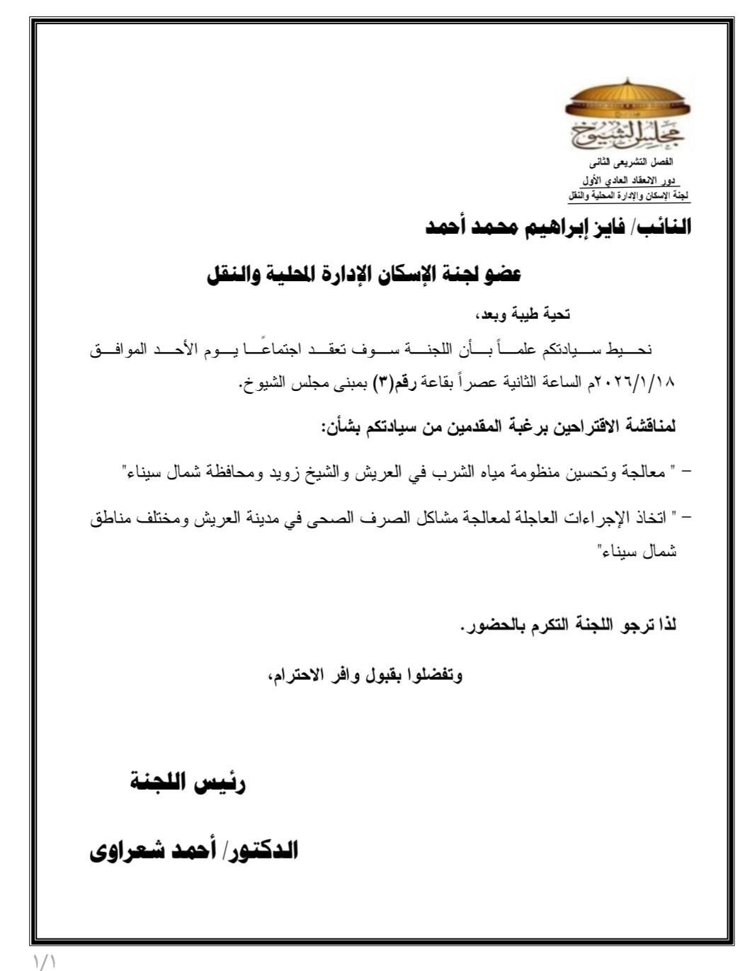أما المقترح الثاني فيتعلق بـاتخاذ الإجراءات اللازمة لحل مشكلات الصرف الصحي بمدينة العريش ومختلف مناطق شمال سيناء، في ظل ما تعانيه بعض المناطق من قصور في شبكات الصرف وما يترتب عليه من آثار بيئية وصحية.