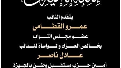 إنا لله و إنا إليه راجعون. يتقدم النائب عمرو القطامي عضو مجلس النواب بخالص العزاء والمواساة إلى النائب عادل ناصر …