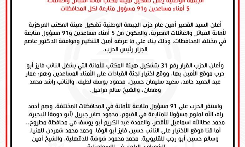 الجبهة الوطنية يعلن تشكيل هيئة مكتب أمانة القبائل والعائلات: 5 أمناء مساعدين و19 مسؤول متابعة لكل المحافظات