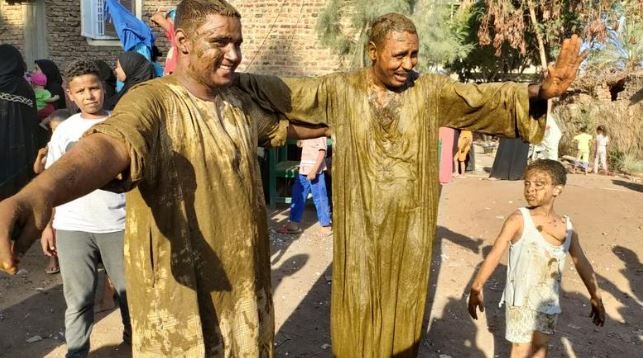 ثم تأتي اللحظة المنتظرة، حين يغمر العريس بالكامل في الحنة، ويبدأ الأهل والأصدقاء بإلقائها عليه وسط موجات من الفرح والسرور، حتى يغطى جسده بها تمامًا، في مشهد يمثل ذروة الطقوس التقليدية لهذه الليلة المميزة.