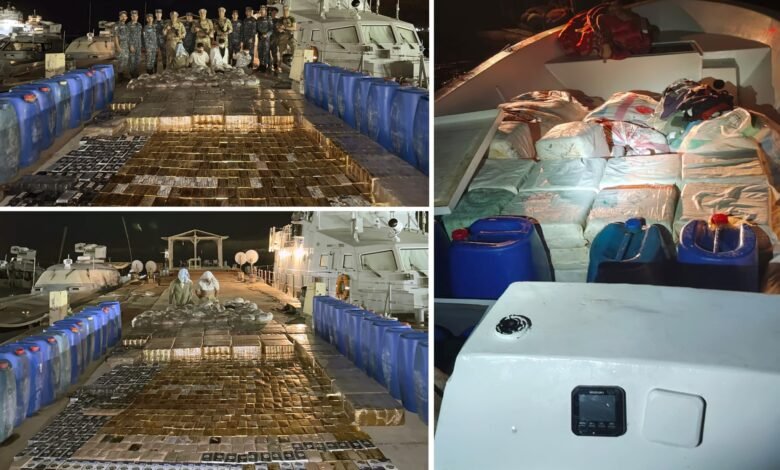 نجحت عدد من الوحدات البحرية التابعة لقاعدة البحر الأحمر البحرية أثناء القيام بأعمال التأمين بنطاق مسئوليتها فى التصدى لمحاولة تهريب كميات من المواد المخدرة بنطاق الأسطول الجنوبى ، من خلال إكتشاف وضبط عدد ( 2 ) فلوكة على متنهما ( 4 ) أفراد بغرض تهريب كميات من المواد المخدرة ، وبتفتيشهما تبين إحتوائهما على عدد ( 13585 ) فرش من مخدر الحشيش بإجمالى وزن ( 1442 ) كجم ، وعدد ( 160 ) لفافة من مخدر الهيدرو بإجمالى وزن ( 172 ) كجم ، وكمية من مخدر الأفيون بإجمالى وزن ( 666 ) كجم ، وتقدر القيمة المالية للمضبوطات ب ( 190 ) مليون جنيه تقريباً ، وقد تم تسليم الأفراد والمضبوطات إلى جهات الإختصاص لإتخاذ الإجراءات القانونية حيالهم.